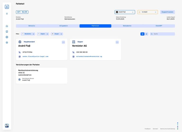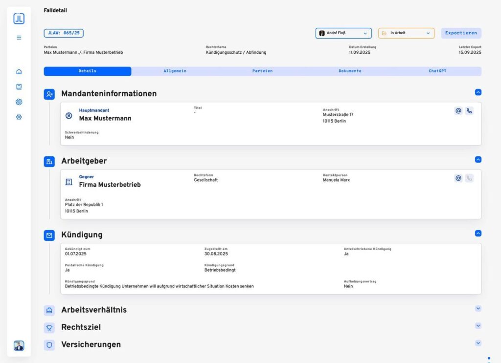Anschließend erhalten Sie eine konkrete Anfrage mit allen notwendigen Informationen, damit Sie direkt mit der Beratung beginnen können – auf Wunsch unterstützt durch den Jura-KI-Assistenten.