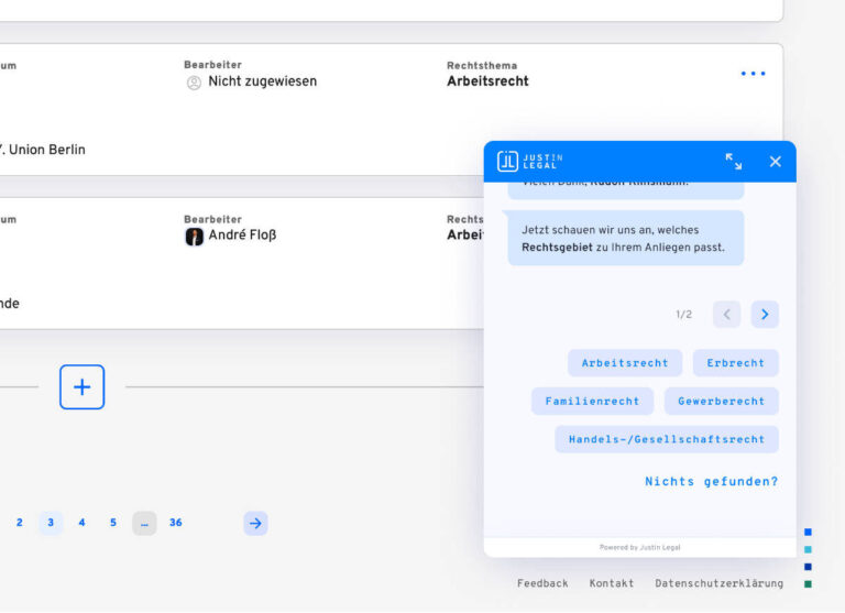 Mandanten zu Mitarbeitern machen – und dadurch sogar mehr Mandate gewinnenDurch geführte Dialoge alle Infos und Dokumente sofort bei der Erstanfrage bekommen. Und das immer passend auf die jeweilige Anfrage: Mit Justin Legal starten Sie nicht erst mit Rückrufen und Anhängen – sondern direkt mit der Beratung.